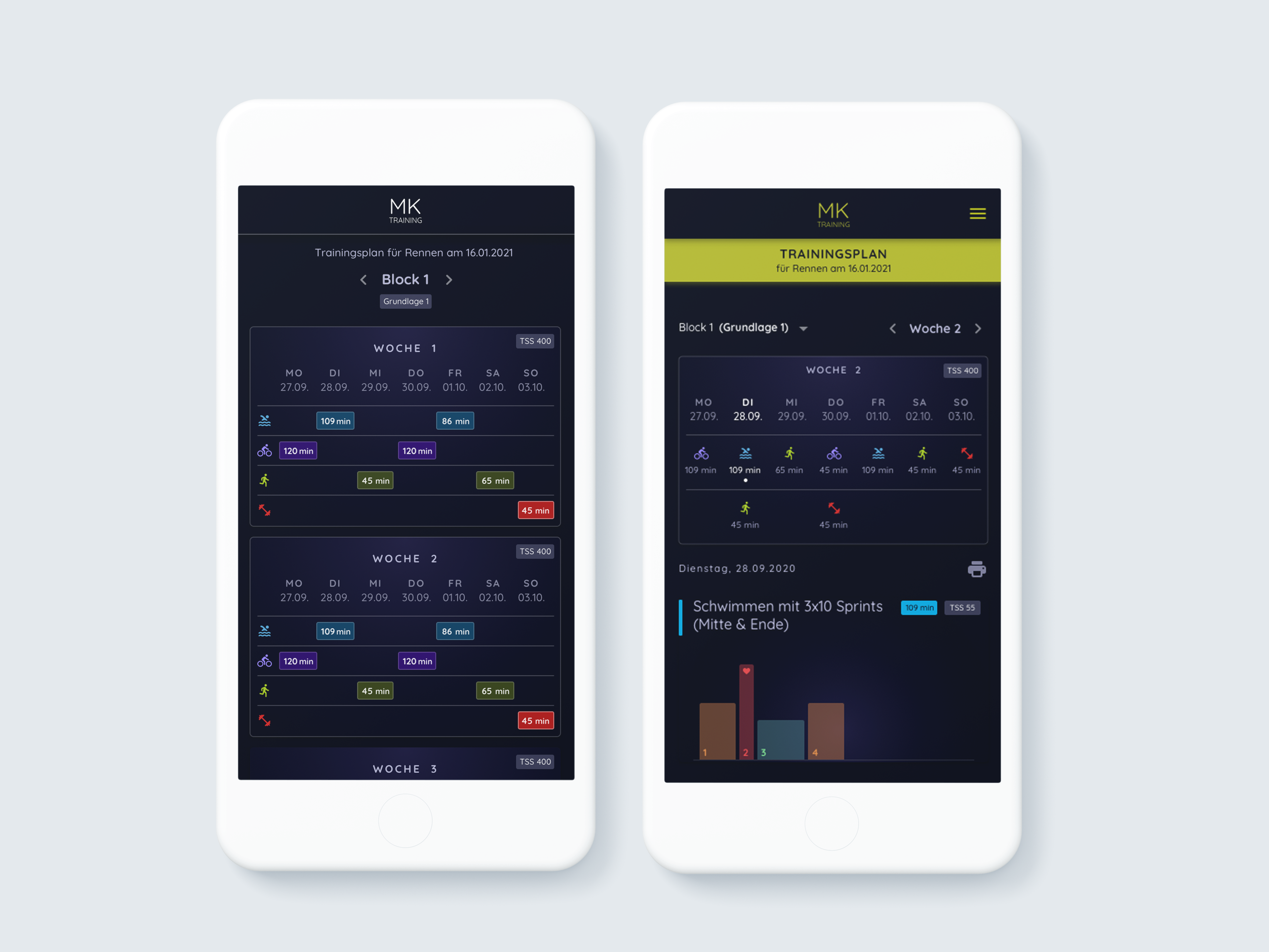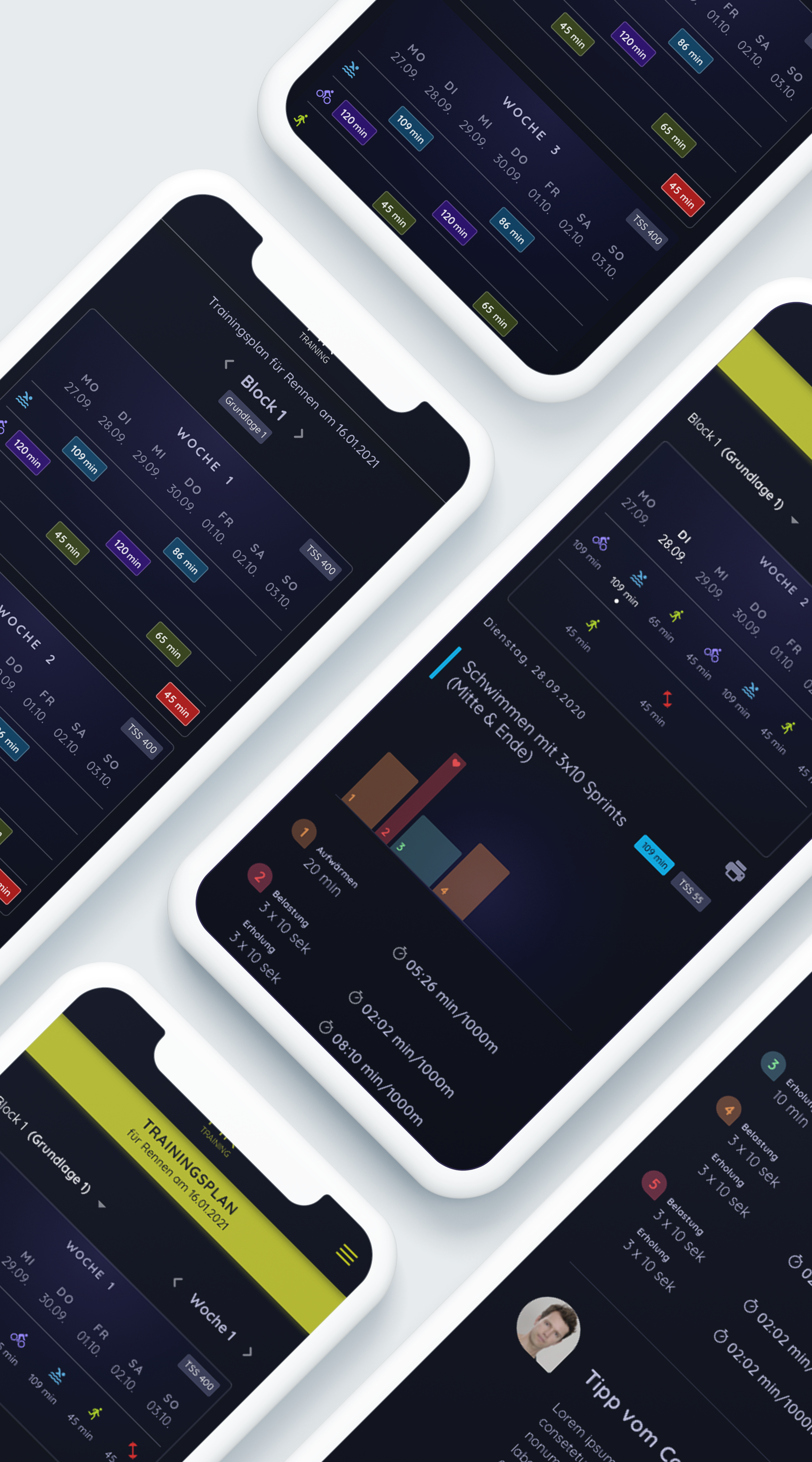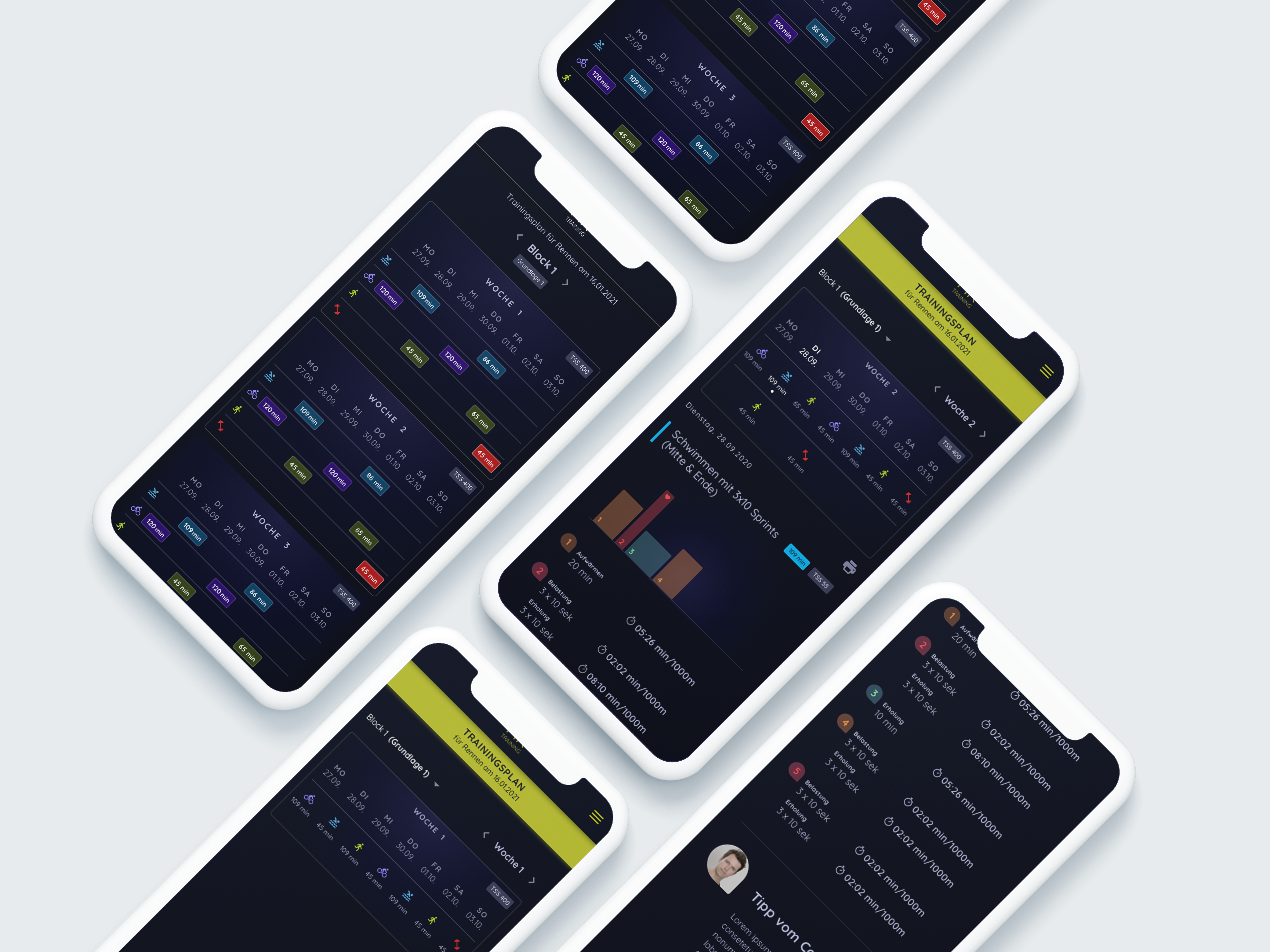 Die visuelle Gestaltung folgt konsequent der Trainingslogik und schafft ein Interface, das auch bei komplexen Plänen einfach nutzbar bleibt.